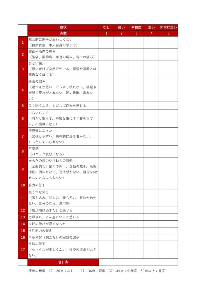 男性更年期障害の評価に国際的に広く使われている指標です。精神的・心理的問題、身体的問題、性機能を含む17の項目からなり、各項目は5段階で評価されます。スコアの合計点で正常、軽度、中等度、重度の症状と分類されます。AMSスコアは、テストステロン補充療法の効果を評価するためにも役立ちます。