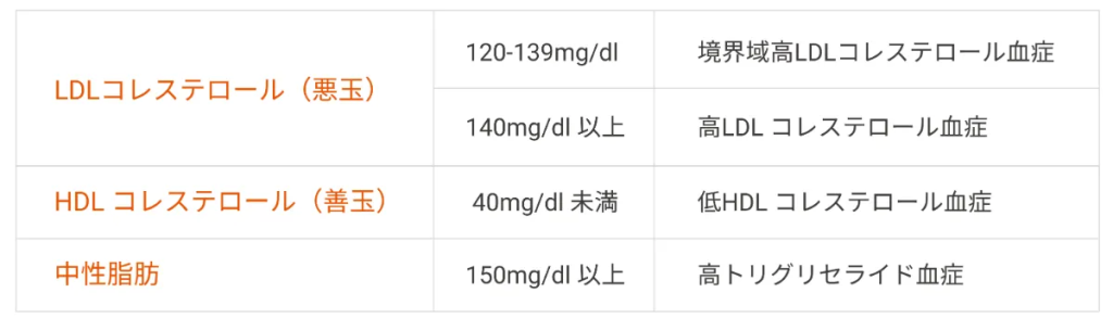 脂質異常症は、数値に異常のある脂質の種類によってタイプが分かれます。