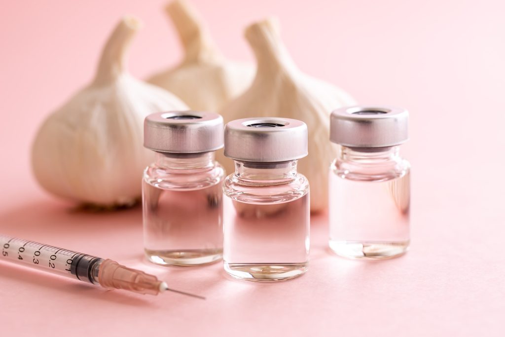 にんにく点滴の主成分はビタミン B1 で、実際ににんにくが入っているわけではありません。中に含まれる硫化アリルという成分がにんにくの匂いがするので(※)、通称「にんにく注射」と呼ばれています。ビタミン B1 は糖質をエネルギーに変える働きを助けます。そのため、ビタミン B1 が不足する と摂取した糖質は分解されず脂肪になり肥満につながります。また、筋肉にたまる疲労物質である乳酸を除去する役割もあり、不足すると疲れがたまりやすい体質になってしまいます。にんにく点滴は全身にビタミン B1 を運び、蓄積した疲労物質を洗い流します。血行が良くなって新陳代謝が高まり、冷え性や体力低下にも効果があります。