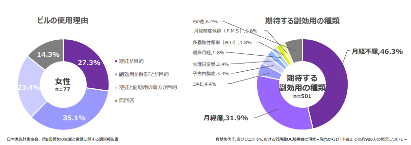 もちろん避妊効果としては、低用量ピルを毎日欠かすことなく服用することで、約99%と十分な効果を得ることができますが、実際にピルを使用している方へのアンケート結果をみると、月経不順や月経痛の緩和などの副効用に期待して使用している割合が多いです。
